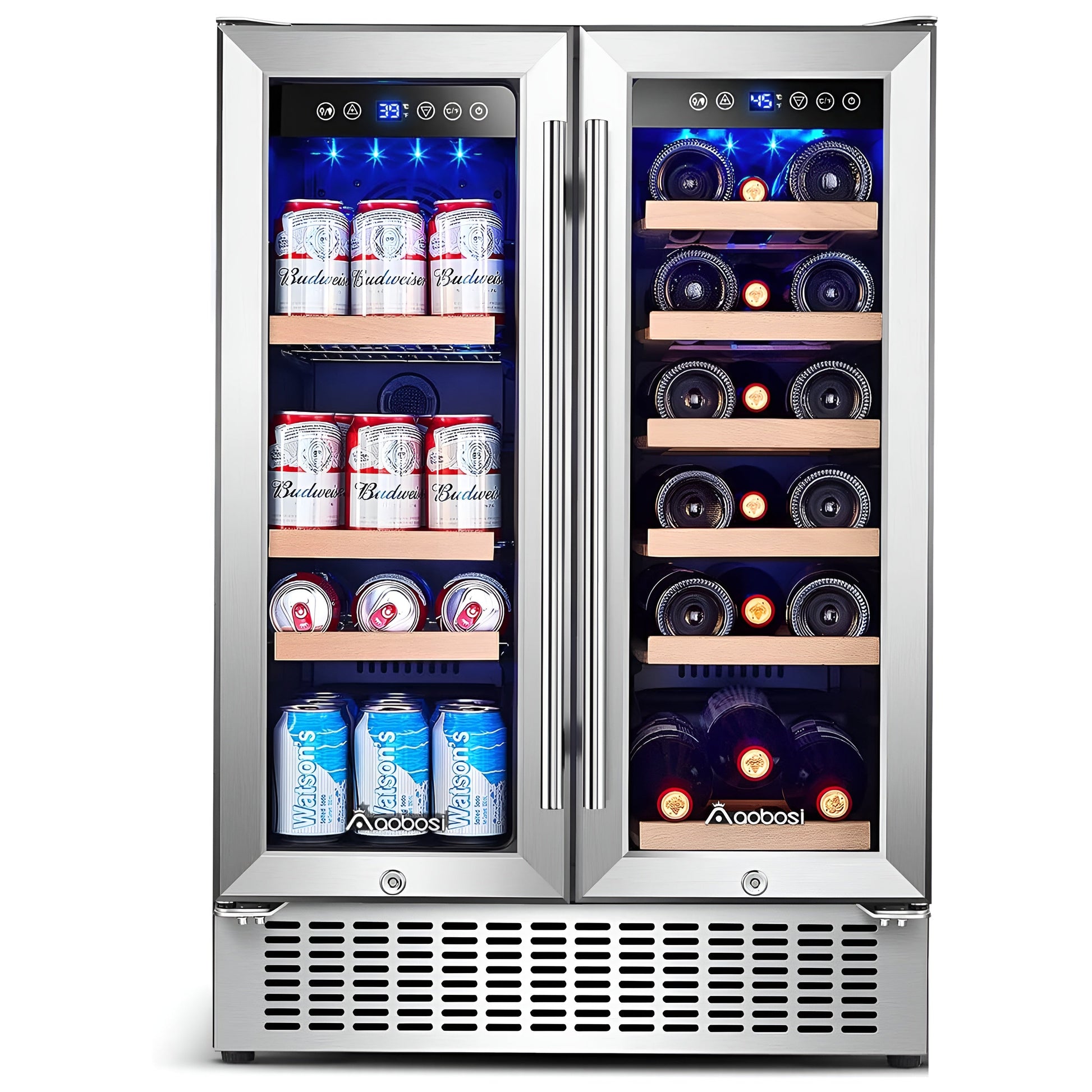 | Special Features | Dual temperature control | Noiseless and vibration-free | keep consistent temperature | Front ventilation | Blue LED lighting | security lock on both door | stainless steel glass door | freestanding or built-in use | removable shelves | user-friendly control panel |
