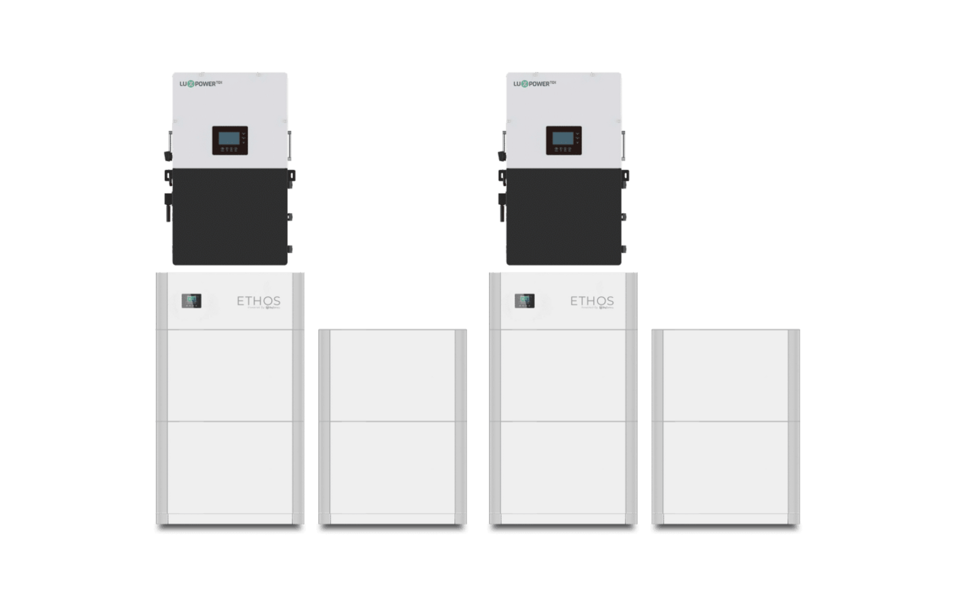 But that’s not all. We pair this ETHOS system with 2 cutting-edge 12000W Lux inverters, which feature their own LCD touch screen displays, 3 MPPT inputs each, integrated UPS modules for seamless on and off-grid switching, and the ability to handle PV arrays of up to 36000W. Plus, through their smart load control, AC coupling abilities, and peak shaving functions, you can meet your power needs and protect your home against unstable grids or rolling blackouts, while seeing huge savings each month on your electric bill.