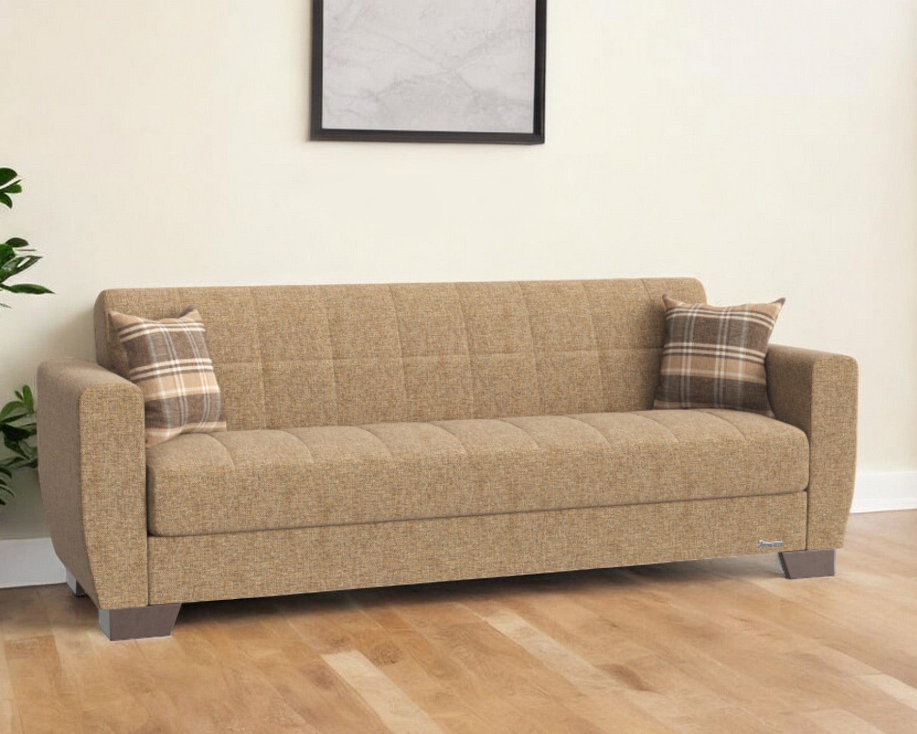 Transform your home's interior with this luxurious 84-inch beige chenille sleeper sleeper sofa and toss pillows with brown legs. With a warm and rich look to it, this solid color sleeper is upholstered in chenille that is designed to be super soft to the touch, sturdy and resilient. Solid colors give you lots of decorative options and are easy to work into your decor scheme. Square arms offer a comfy place to rest. Brown solid wood legs effortlessly elevate the room and add a touch of contemporary design. A great showpiece for your room, this sofa is a must have. 32-inch H x 84-inch W x 28-inch D