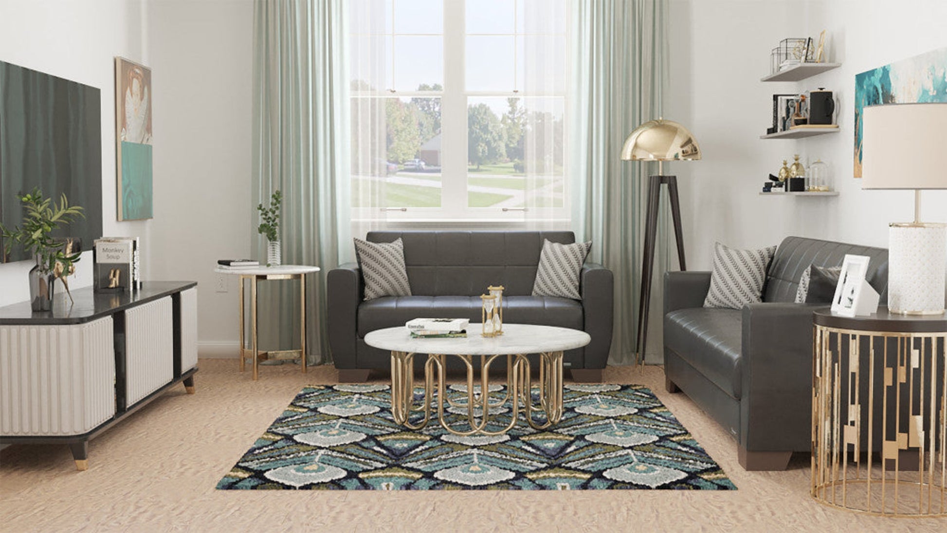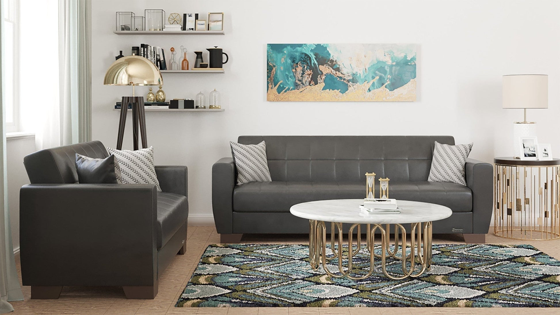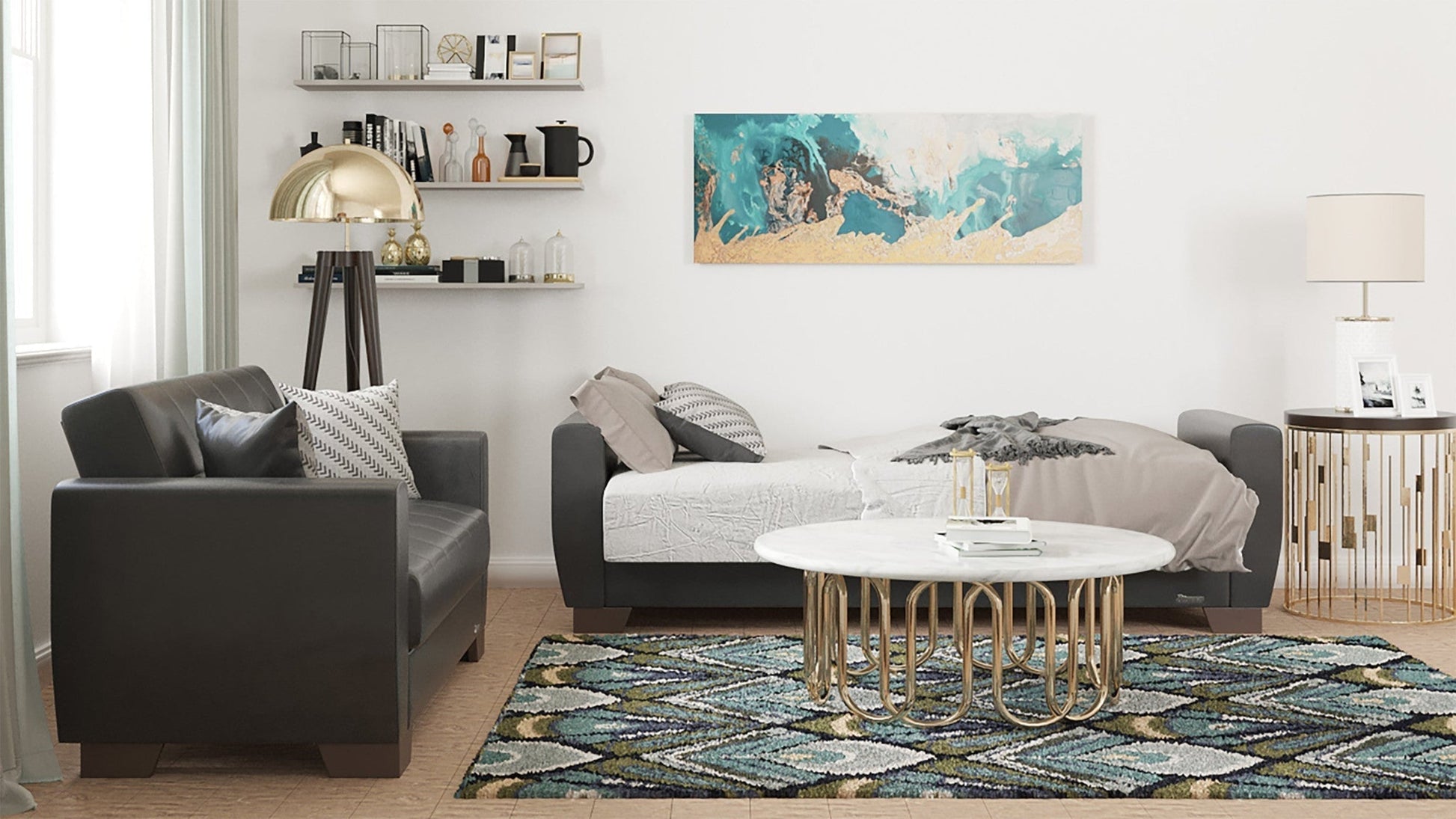 A: The modern black faux leather and elegant brown legs make this sofa a great fit for contemporary, transitional, and modern interiors.