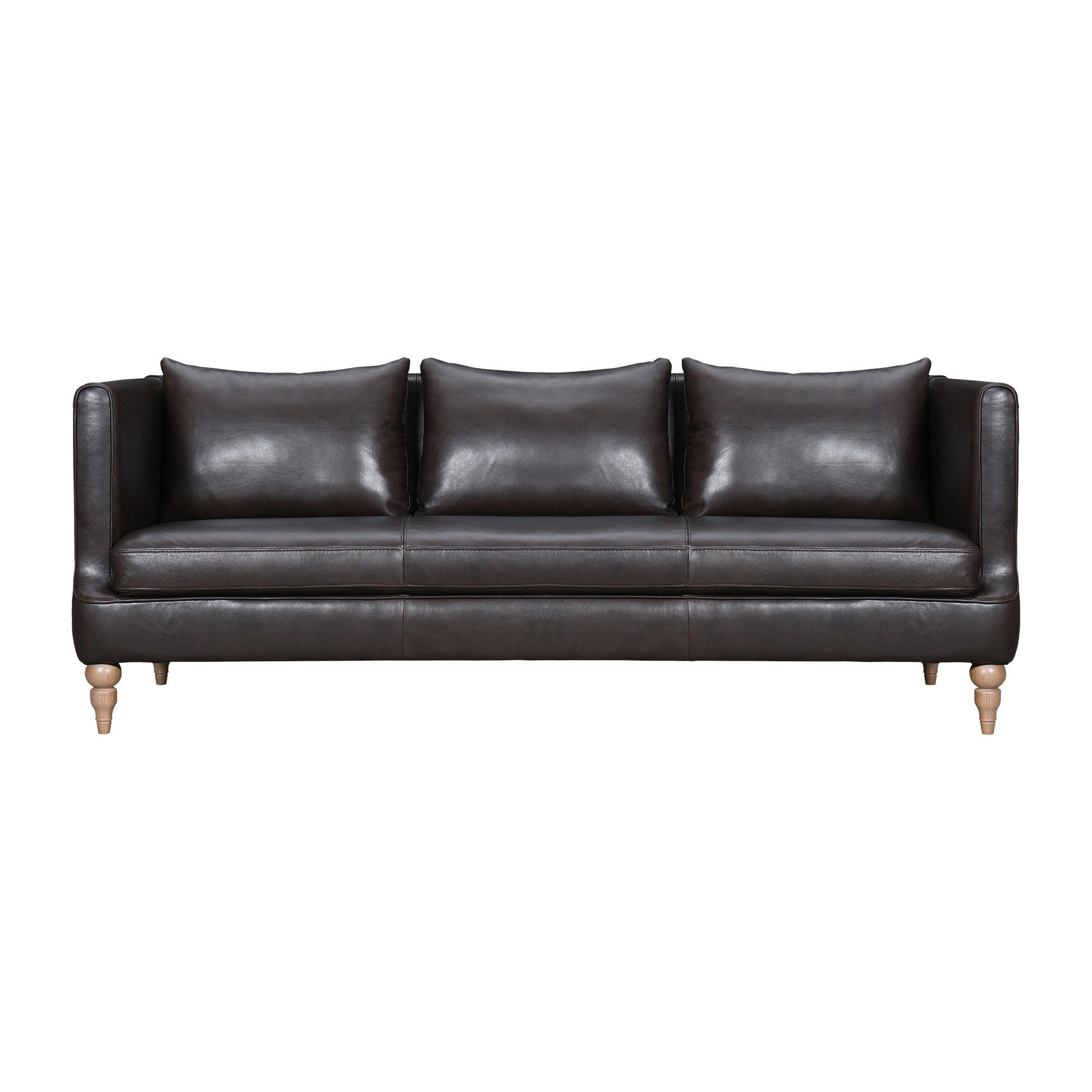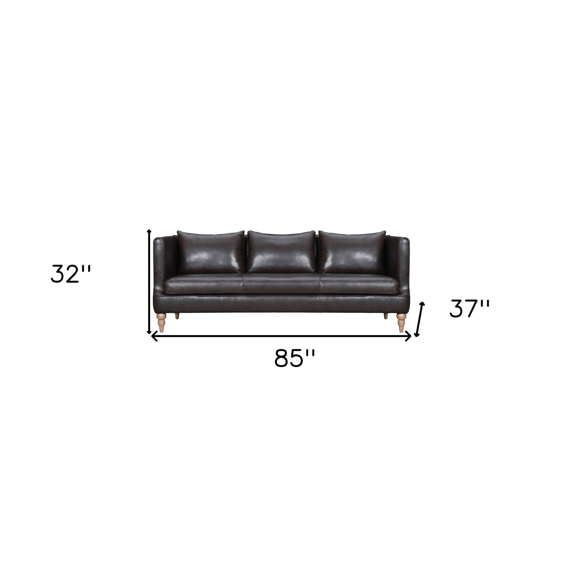 An interior designer's dream, this buttery soft high grade leather 85-inch dark brown leather sofa with brown legs will bring just the right touch to your space. The premium leather used makes your lounging luxuriously comfortable and adds an elegant appeal to your space. Solid colors give you lots of decorative options and are easy to work into your decor scheme. Sinuous springs construction gives this piece strong support and makes it comfortable to sit even for long periods of time. Tuxedo arms offer a comfy place to rest. A great showpiece for your room, this sofa is a must have. 32-inch H x 85-inch W x 37-inch D