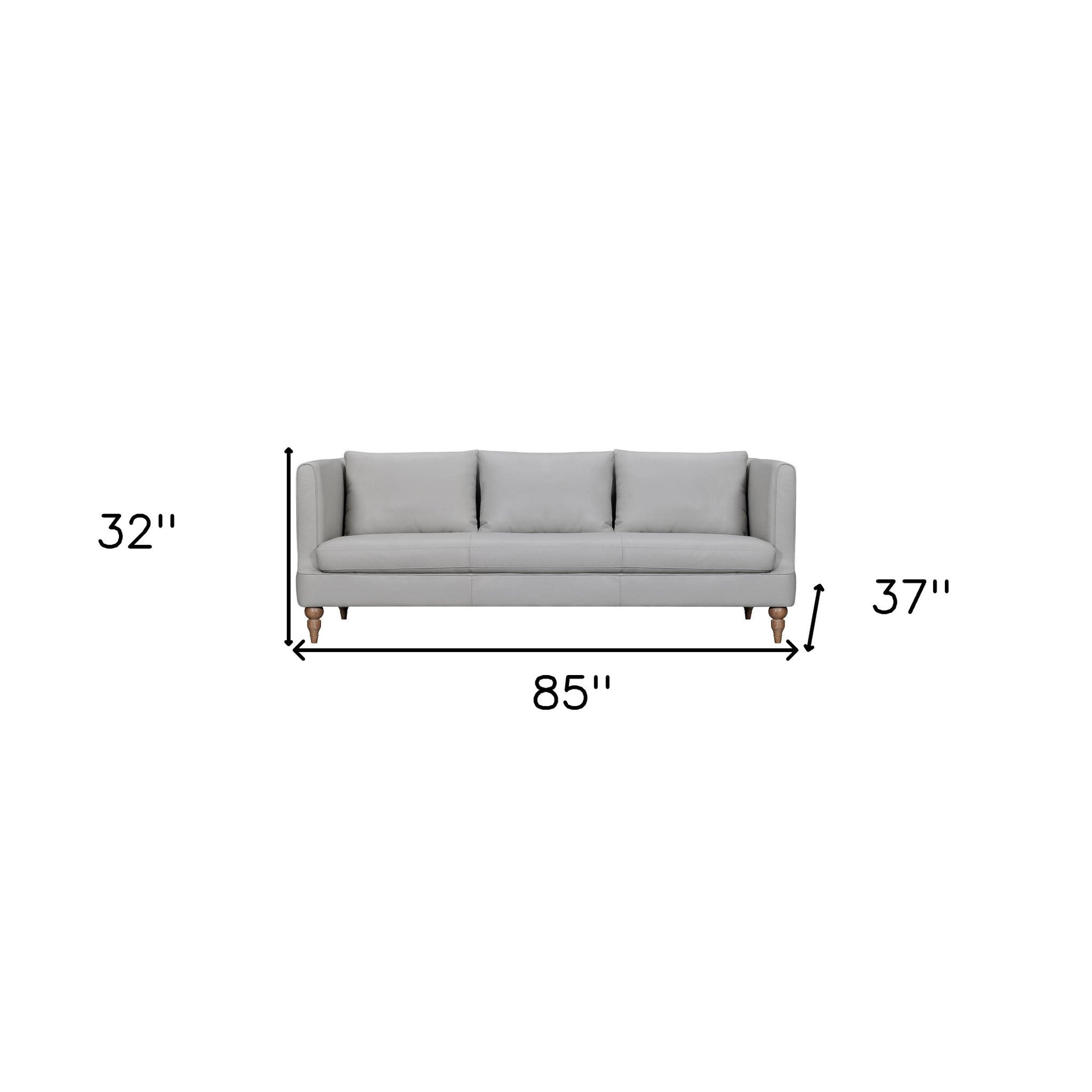 An interior designer's dream, this buttery soft high grade leather 85-inch gray leather sofa with brown legs will bring just the right touch to your space. The premium leather used makes your lounging luxuriously comfortable and adds an elegant appeal to your space. Solid colors give you lots of decorative options and are easy to work into your decor scheme. Sinuous springs construction gives this piece strong support and makes it comfortable to sit even for long periods of time. Tuxedo arms offer a comfy place to rest. Built to last, this sofa will be a great centerpiece for your room. 32-inch H x 85-inch W x 37-inch D