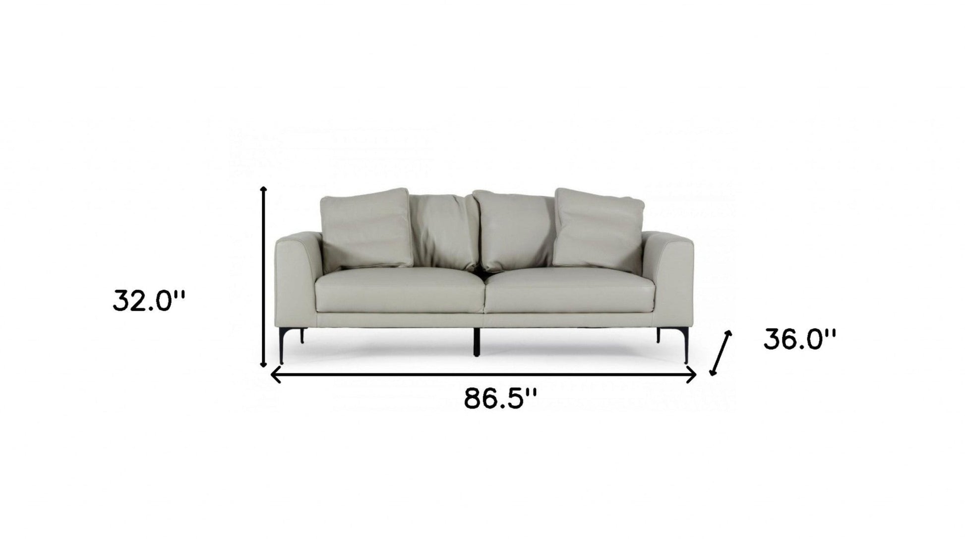 Made of the highest quality, supple leather, this 87-inch gray genuine leather sofa with black legs will be the star of your space. The high grade premium leather used makes your lounging luxuriously comfortable and adds an elegant appeal to your space. Solid colors give you lots of decorative options and are easy to work into your decor scheme. Sinuous springs construction gives this piece strong support and makes it comfortable to sit even for long periods of time. Square arm offer a comfy place to rest. Black metal legs effortlessly elevate the room and add a touch of contemporary design. A great showpiece for your room, this sofa is a must have. 32-inch H x 86.5-inch W x 36-inch D