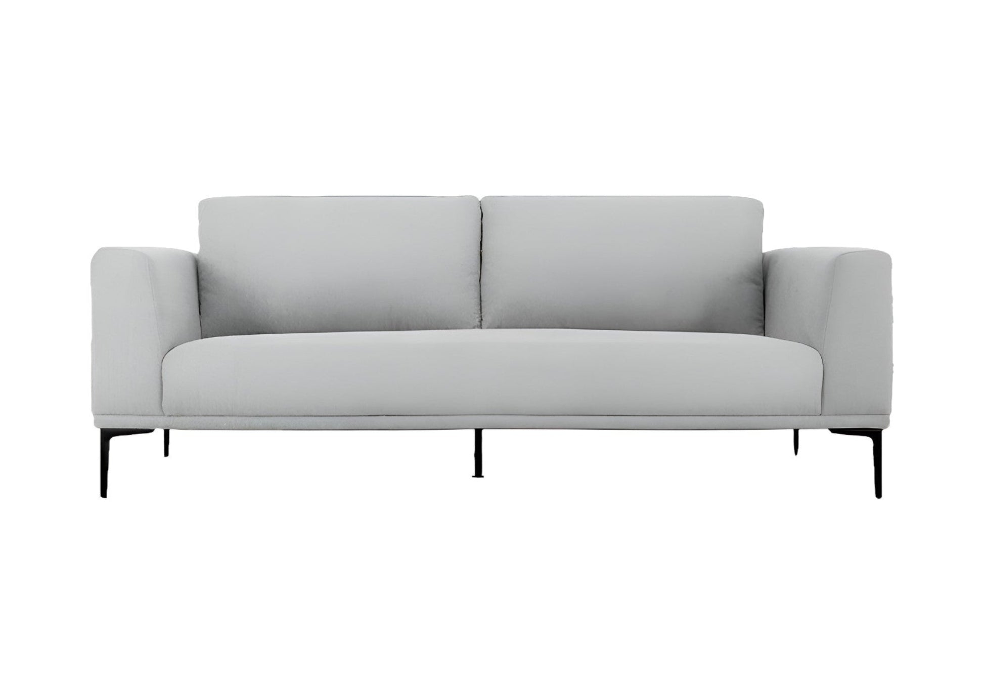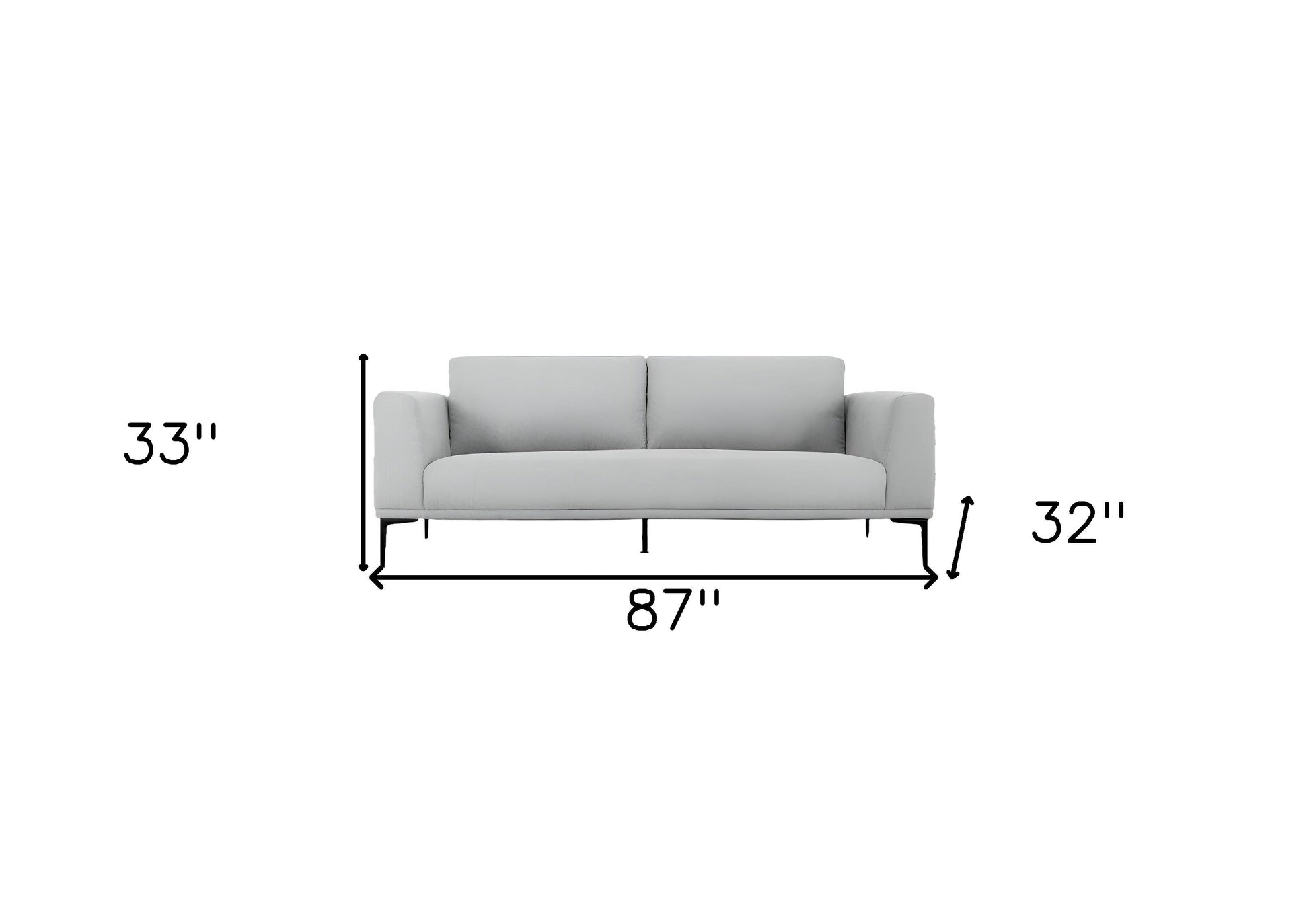 Designed for comfort and good looks, this 87-inch light gray sofa with black legs is a great option to anchor your space. This solid color standard is made from soft, sturdy, and resilient 100% polyester that is a good option for families and in frequently used seating areas. Solid colors give you lots of decorative options and are easy to work into your decor scheme. Sinuous springs construction gives this piece strong support and makes it comfortable to sit even for long periods of time. Removable seat cushions make this sofa easy to manage. Square arm offer a comfy place to rest. Black metal legs effortlessly elevate the room and add a touch of contemporary design. Built to last, this sofa will be a great centerpiece for your room. 33-inch H x 87-inch W x 32-inch D