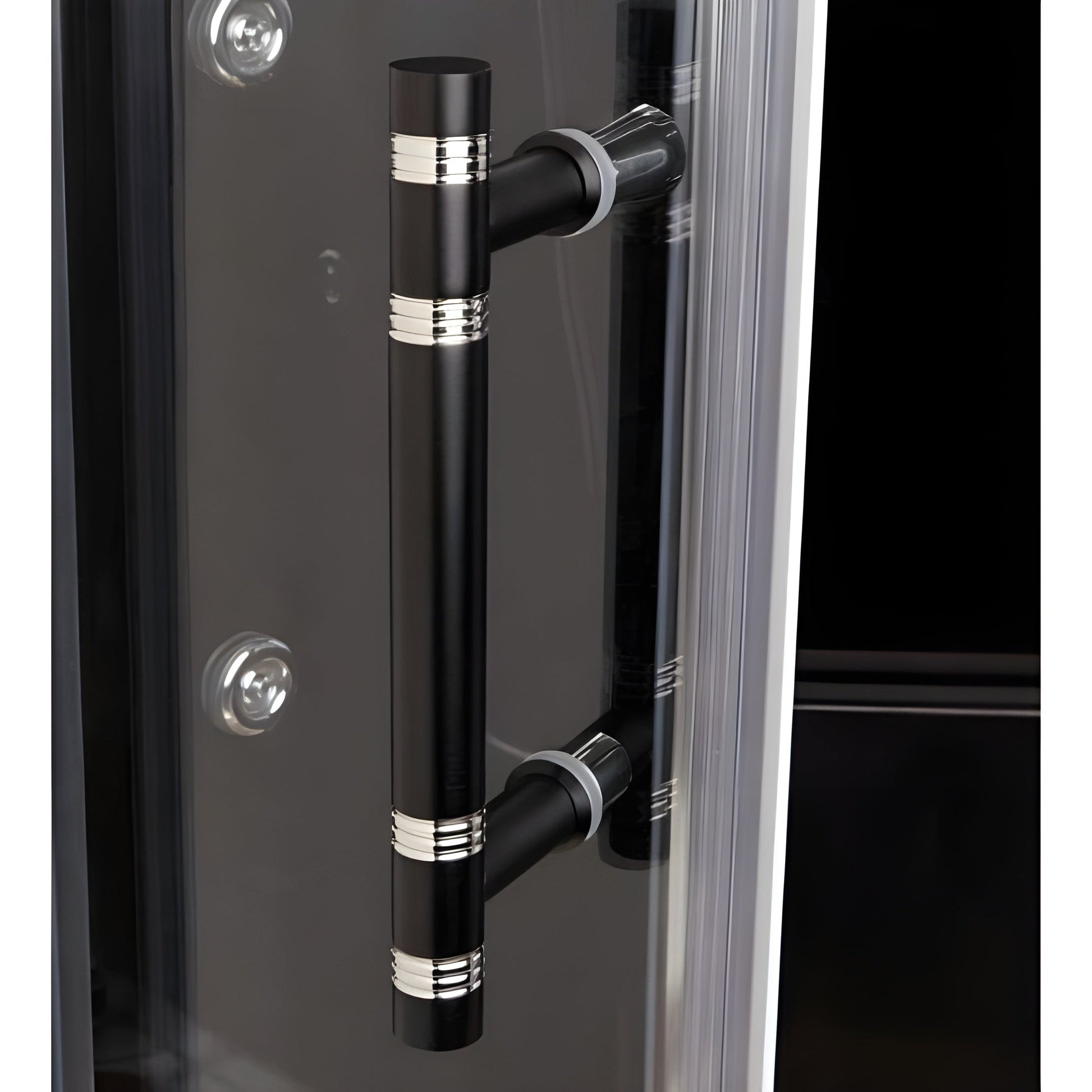 A: The shower is constructed from durable black tempered glass and stainless steel, offering a sleek, modern look and long-lasting quality.