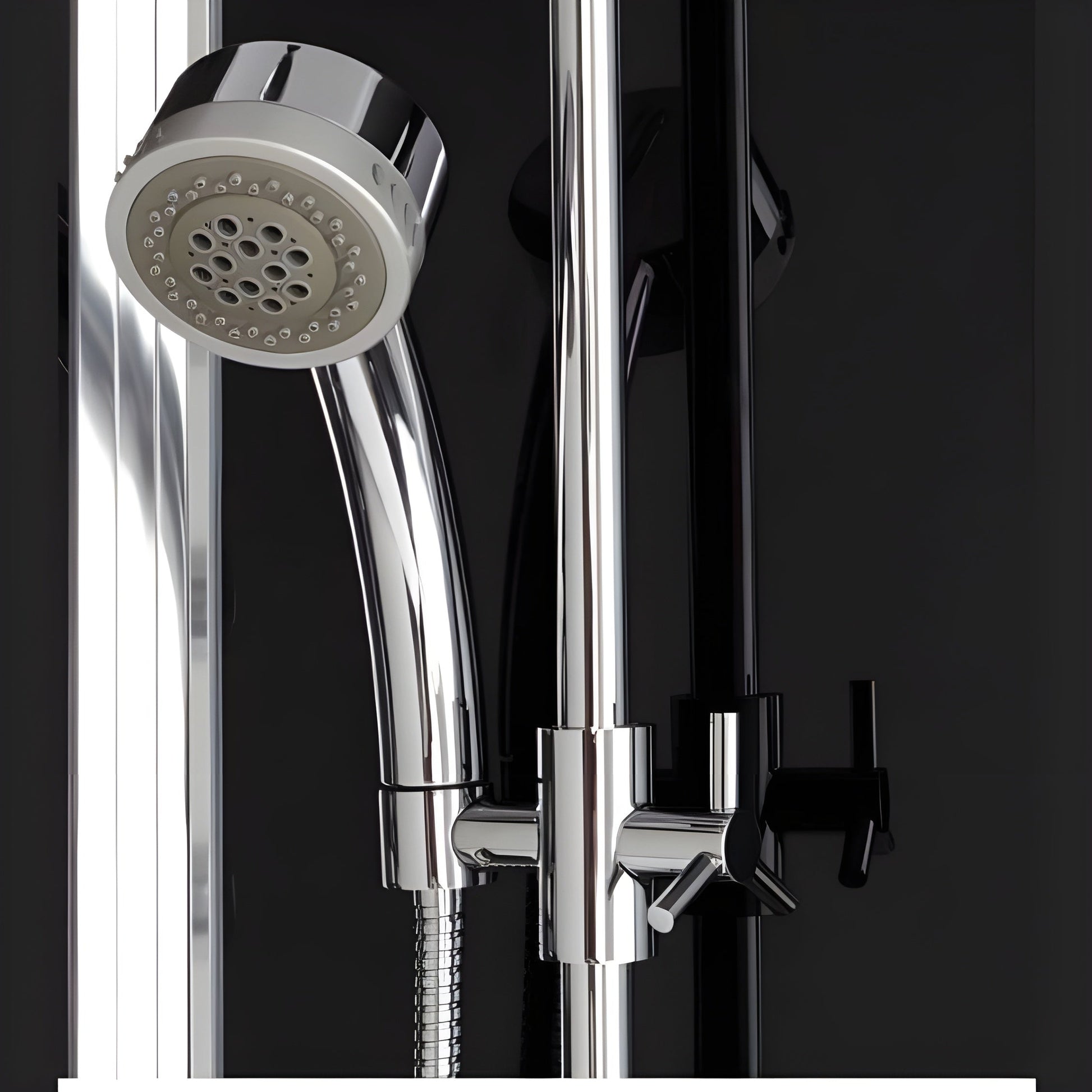 A: The shower features tempered glass, stainless steel accents, and a durable acrylic base, ensuring longevity and a contemporary aesthetic.