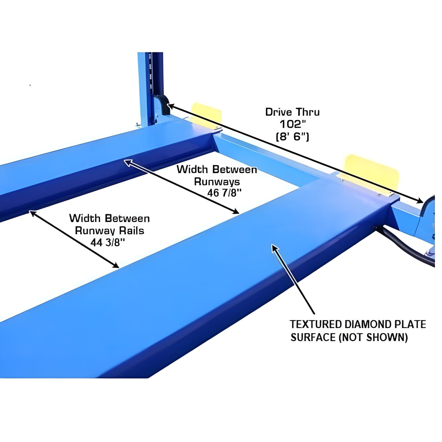 Finally, the Atlas 414 features tracks between the runways to allow the use of a rolling bridge jack (such as the Atlas RJ8000BK) on the lift. Rolling jacks sold separately.