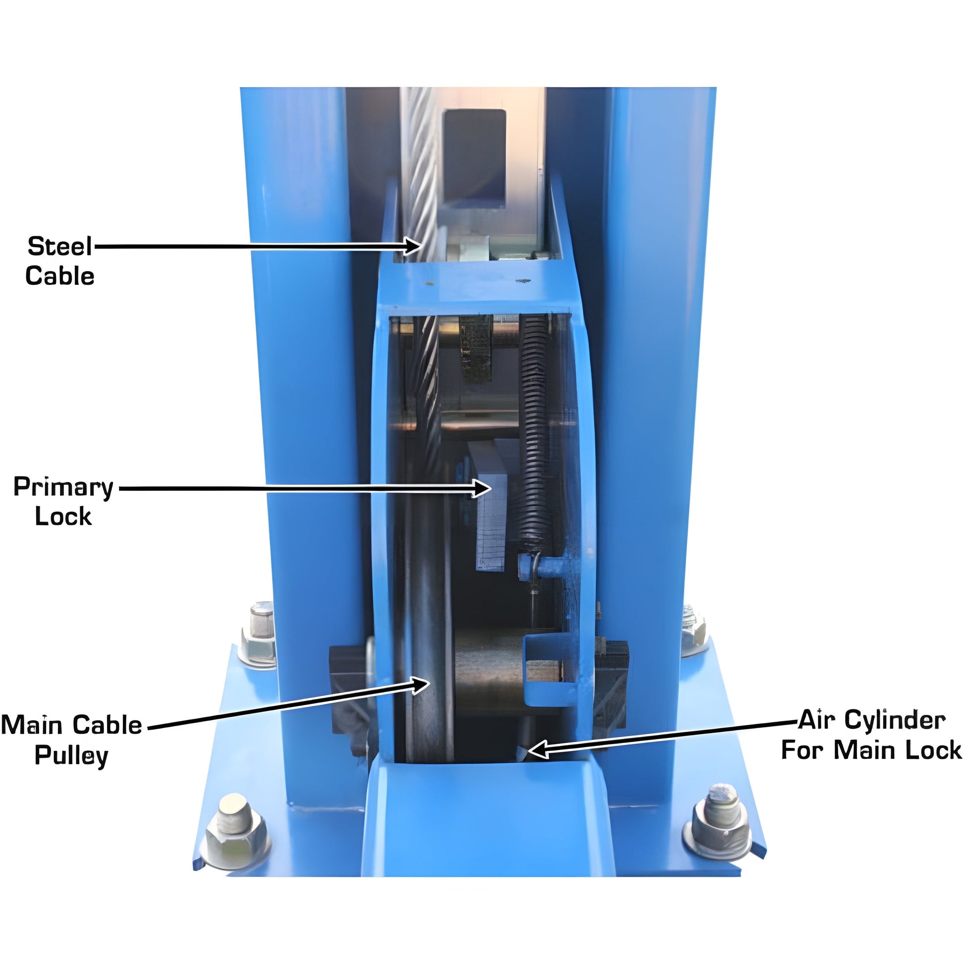 The Atlas 414 uses a high strength cable system (with a under runway oversized hydraulic cylinder) powered by a 220 volt (single phase) power unit to raise and lower the lift. Many competitors use an old style chain lifting system with an exposed hydraulic cylinder system. Old style chain lifts are difficult to level properly and the exposed hydraulic cylinder is responsible for numerous door dings.