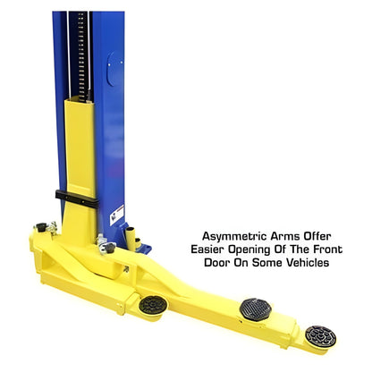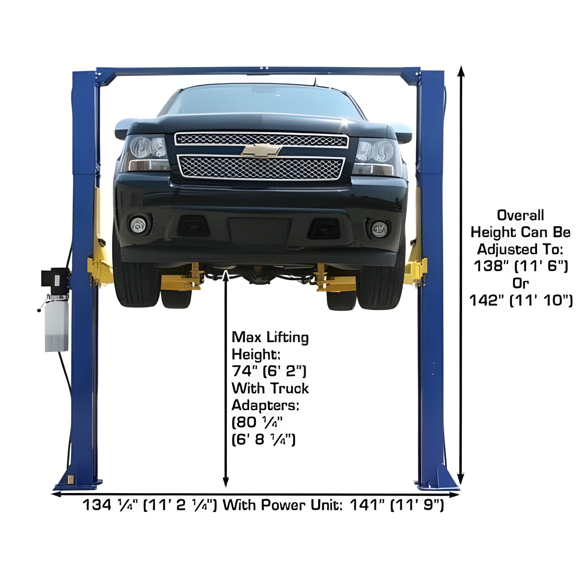 Atlas Overhead 9,000lb. Capacity 2-Post LiftThe light duty Atlas 9KOHX lift is an economy designed overhead, clear-floor 2-post lift. The reliable chain-drive cylinders and dual safety system make this the perfect choice for Mr. Homeowner or small commercial shops looking to service cars, SUVs and light duty trucks. The 9KOHX can be adjusted to two different height settings, either 11' 6" or 11' 10", allowing it to fit in almost any standard garage.The Atlas 9KOH has symmetric columns and specially designed arms that can be set in either the symmetric or asymmetric position. The asymmetric/symmetric arm design offers an extremely low lift pad position on the EZ-metric lift arm configuration. This low pad height will allow the operator to position the lift arms under most small cars (with low pick up points) and heavier pick up trucks. The Atlas 9KOHX two post chain over roller lifts have a spring loaded Secondary Lock System (SLS) that automatically engages in the event of a slack or broken chain.The 9KOHX is the perfect choice for those who demand the most lifting capacity at the lowest possible price.