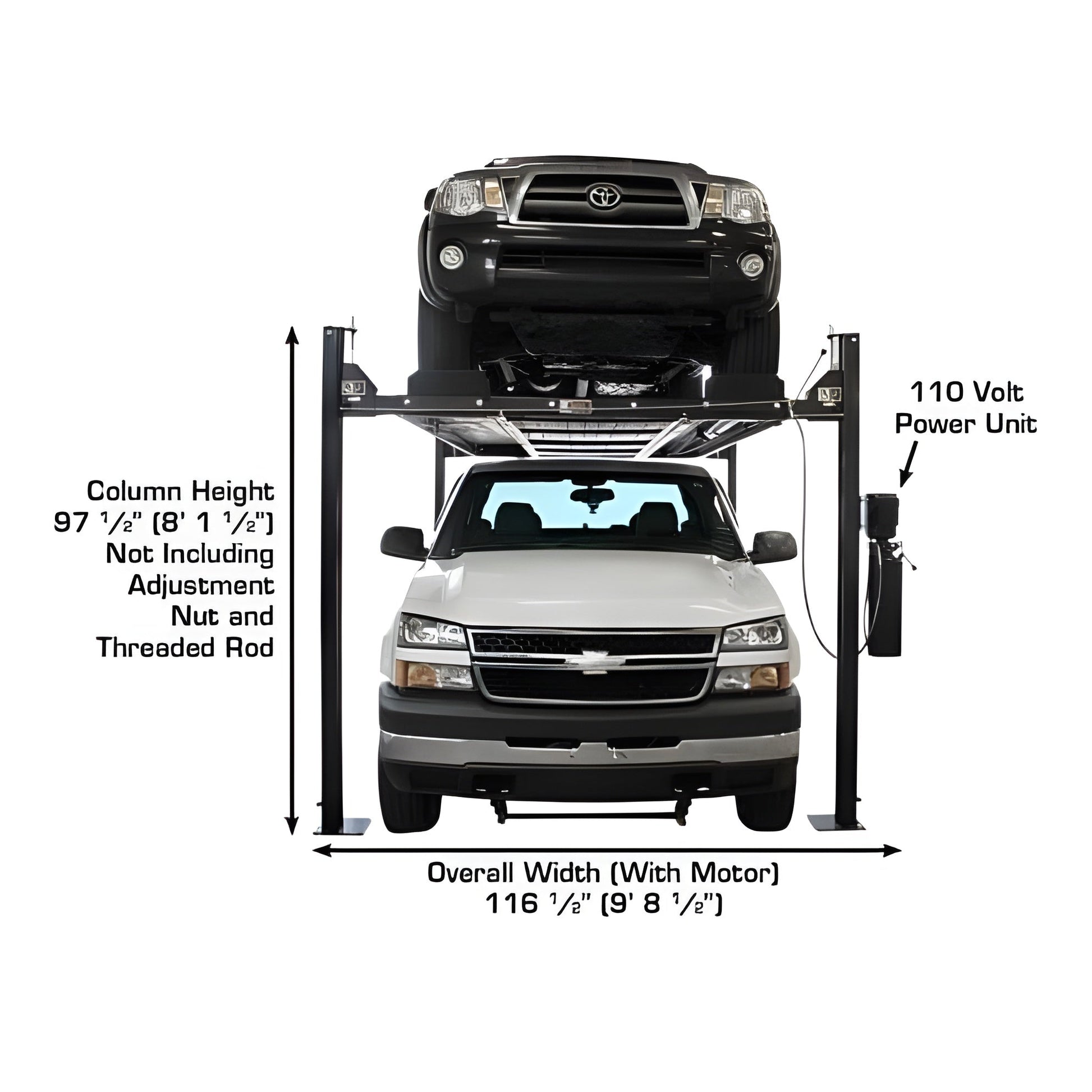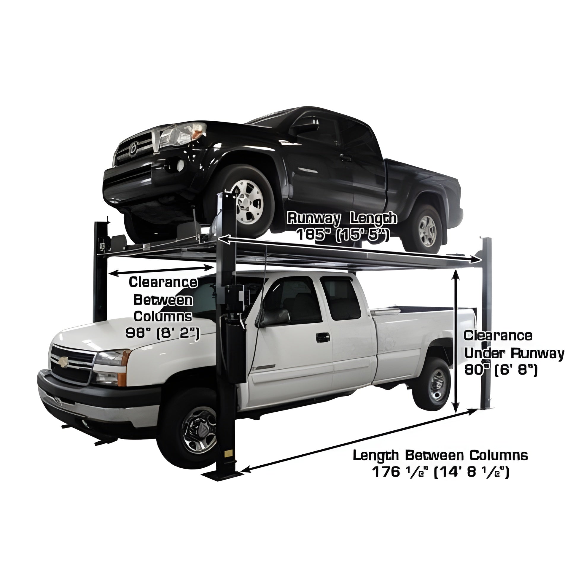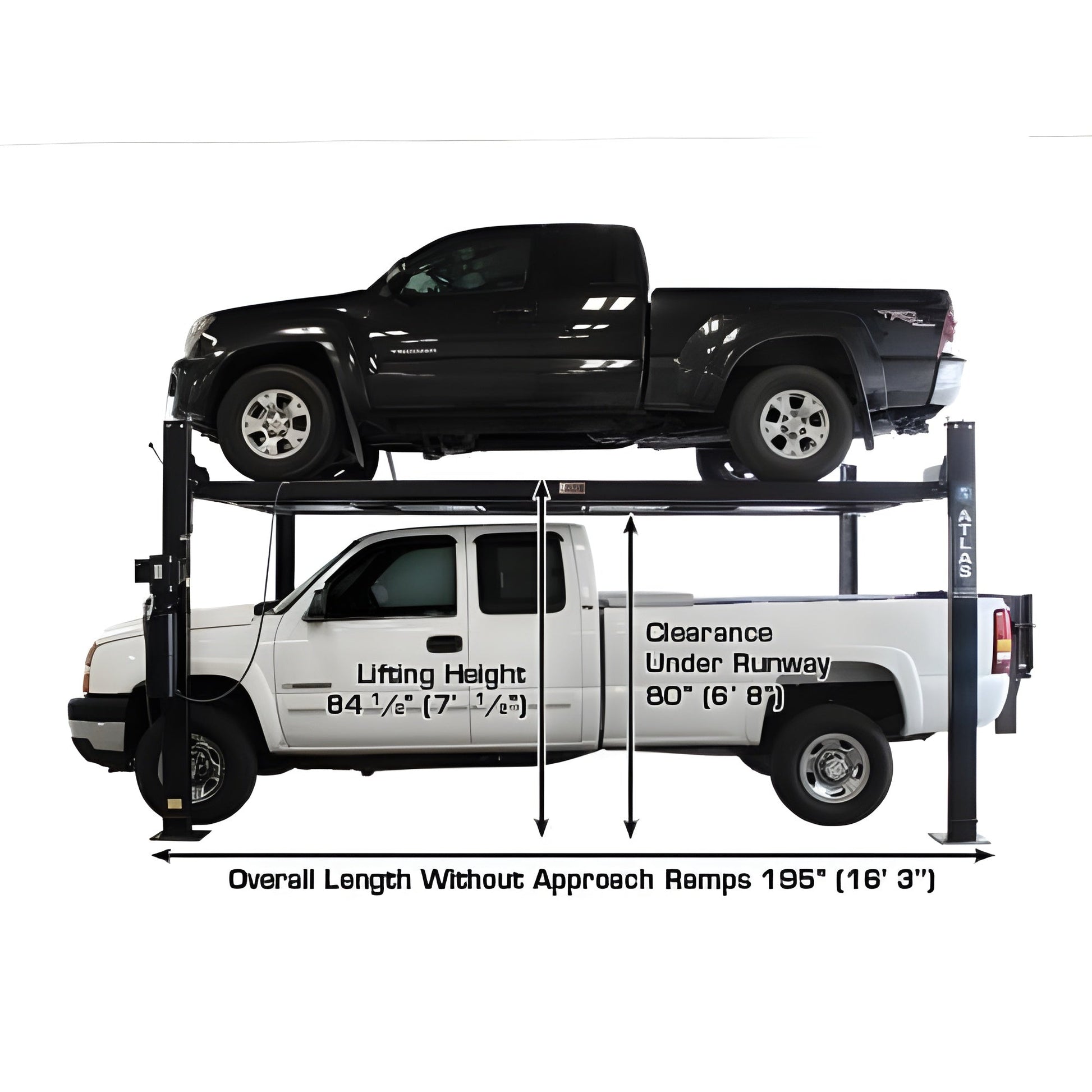 The Atlas Garage PRO8000EXT-L features the extra lifting height of the PRO8000EXT but is also 20 inches longer and 3 inches wider. Or to compare to the original, the Garage PRO8000EXT-L is 20 inches longer, 3 inches wider, and 14 inches taller than the standard Atlas Garage PRO8000! The extra runway length will accommodate almost all of the longer wheelbase pickup trucks, except duallys. This is because the dual rear wheels are TOO WIDE to fit between the column lock assemblies. Check out the Atlasยฎ Garage PRO9000 if you need a portable lift for your dually!The Atlas Garage PRO series of 4-post lifts (8,000 lb. capacity) are designed and built for use by homeowners or restoration shops. These lifts are not desinged for use in commercial repair shops where they would be raised and lowered several times per day. If you have questions about which lift would best work in your application please contact a salesperson..The Atlas Garage PRO8000EXT-L includes free plastic drip trays, a free steel jack tray, and a free caster kit with polyurethane wheels. The caster kit can be installed or removed in just a matter of minutes making the lift portable and allowing it to move between bays or even outside.Many customers who purchased this lift also purchased the Atlas RJ35.