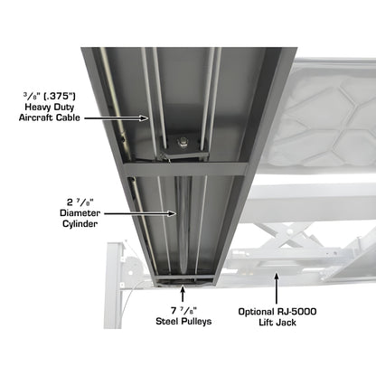 The Atlas 408SL super deluxe portable vehicle storage lift is designed for those car enthusiasts who demand the absolute best look and superior quality. The 408SL has all the great features of our Atlas Garage Pro Series 4 post hobbyist lifts, but incorporates many features found only on our Atlas commercial grade 4-post lifts. All columns incorporate two special bends which help to increase the column strength. These strategic bends also increase the surface area for the slide block to travel. Horizontal cables are “hidden” inside of the cross tubes. Professional grade wheel covers are used to eliminate almost all exposure of cables and the double lock system. The Atlas 408SL has “more metal” and weighs over 100 lbs. more than other hobbyist lifts based upon the same column and runway configuration.The Atlas 408SL is built to the same commercial lift standards as our Atlas 412 and Atlas 414 four post lifts, but also offers portability (Caster Kit included).If you are looking for a lift that stands out from all the other storage lifts sold in the USA, then take a good look at the Atlas 408SL.This combo package also includes two of the popular Atlas RJ35 sliding bridge jacks. The jacks are perfect for raising a vehicles wheels off the lifts runways in order to do wheel service and brake work.
