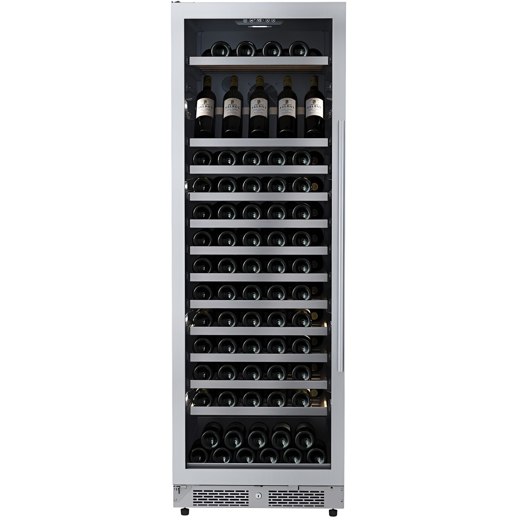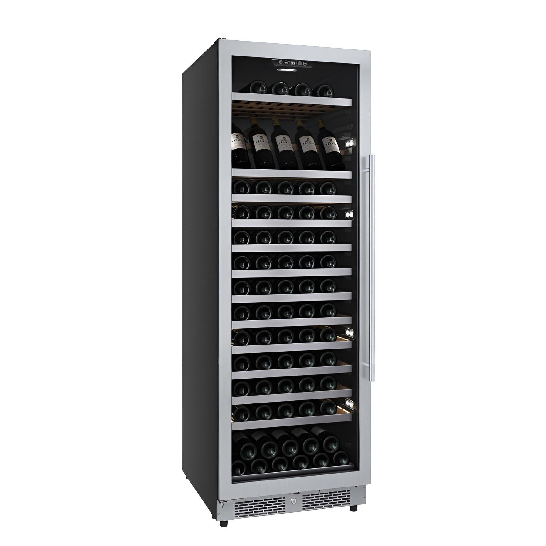 A: A large-capacity wine cooler with a 150-bottle capacity, designed for built-in or freestanding use. It features wood shelves, a child lock, door alarm, and secure door lock—perfect for serious wine collectors and families.