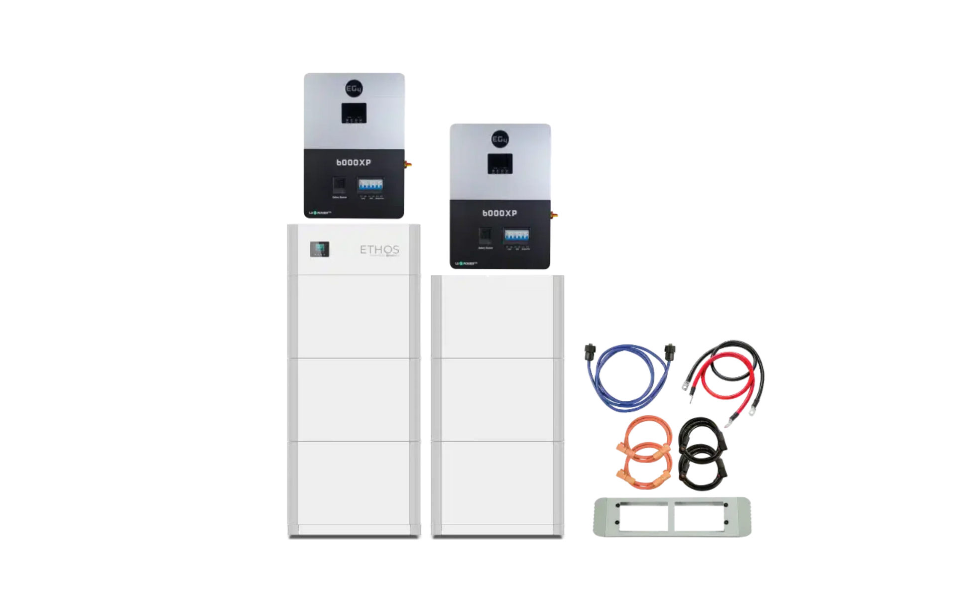 But that’s not all. We pair our ETHOS with two cutting-edge 6000W split-phase inverter-chargers from EG4, which each feature their own LCD touch screen display, 2 MPPT inputs, an integrated UPS module for seamless on and off-grid switching, and the ability to handle PV arrays of up to 8000W. Plus, through their smart load control, AC coupling abilities, and peak shaving function, you can meet your power needs and protect your home against unstable grids or rolling blackouts, while seeing huge savings each month on your electric bill through peak shaving and time-of-use offsetting.