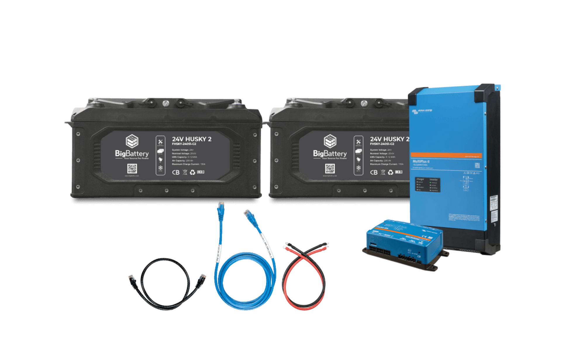 A: A 24 V LiFePO₄ battery kit with one HUSKY 2 module and a compatible Victron inverter/charger — designed as a maintenance-free replacement for 24 V lead-acid systems.
