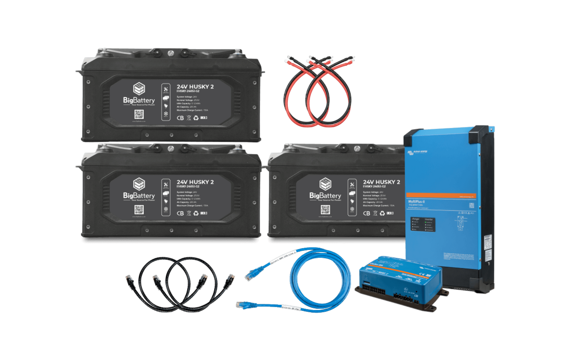 A: A 24 V LiFePO₄ battery kit with one HUSKY 2 module and a compatible Victron inverter/charger — designed as a maintenance-free replacement for 24 V lead-acid systems.