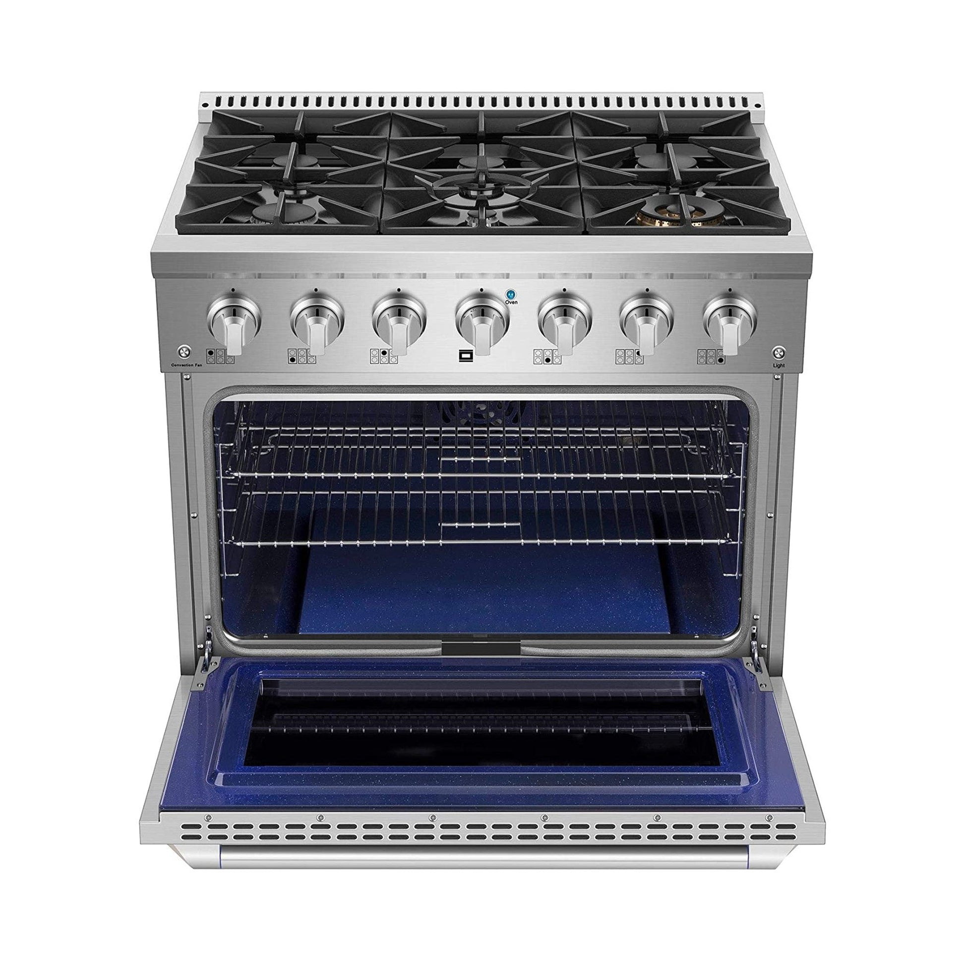 A: The gas range features 6 high-performance burners for versatile cooking.