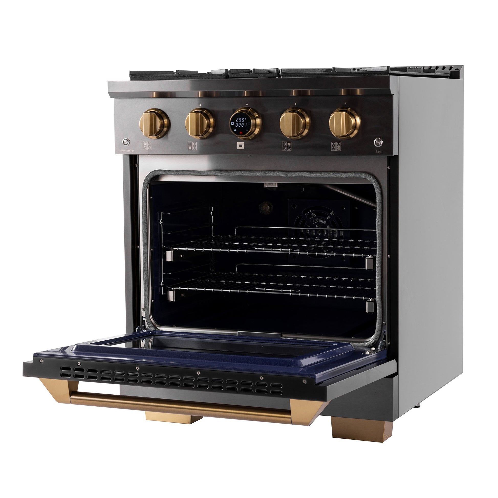 The Kucht 30" 4.2 cu. ft. 4 Burner Natural Gas Dual Fuel Range in Titanium Stainless Steel with Digital Thermostat (KXD30) combines professional performance with modern technology.