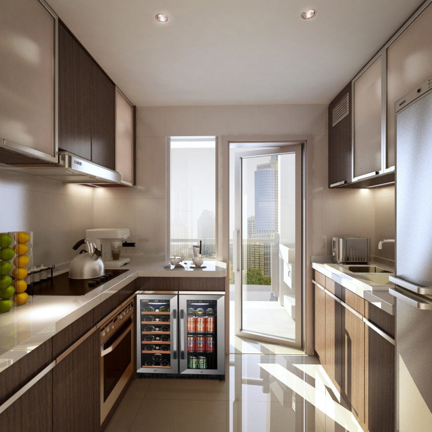 This beverage refrigerator can place in the corner or under the cabinet because of the large vents. To completely remove the shelf, the minimum angle for the door opens is 90 degrees, which can save more space for enjoying delicious drinks.