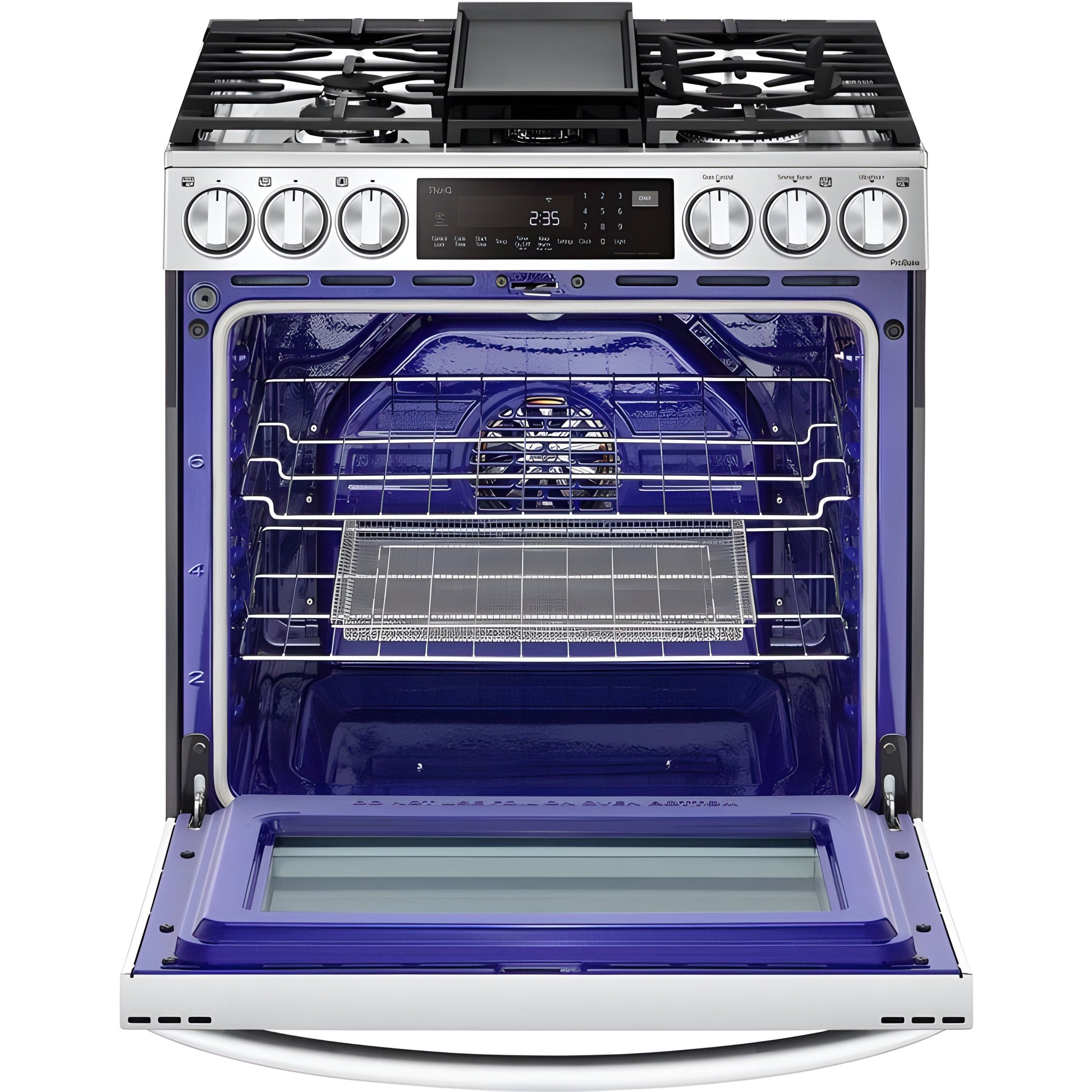 A: This advanced gas range features ProBake Convection for even baking, InstaView for a quick look inside, and built-in Air Fry for crispy, oil-free cooking—all in a sleek stainless steel design.