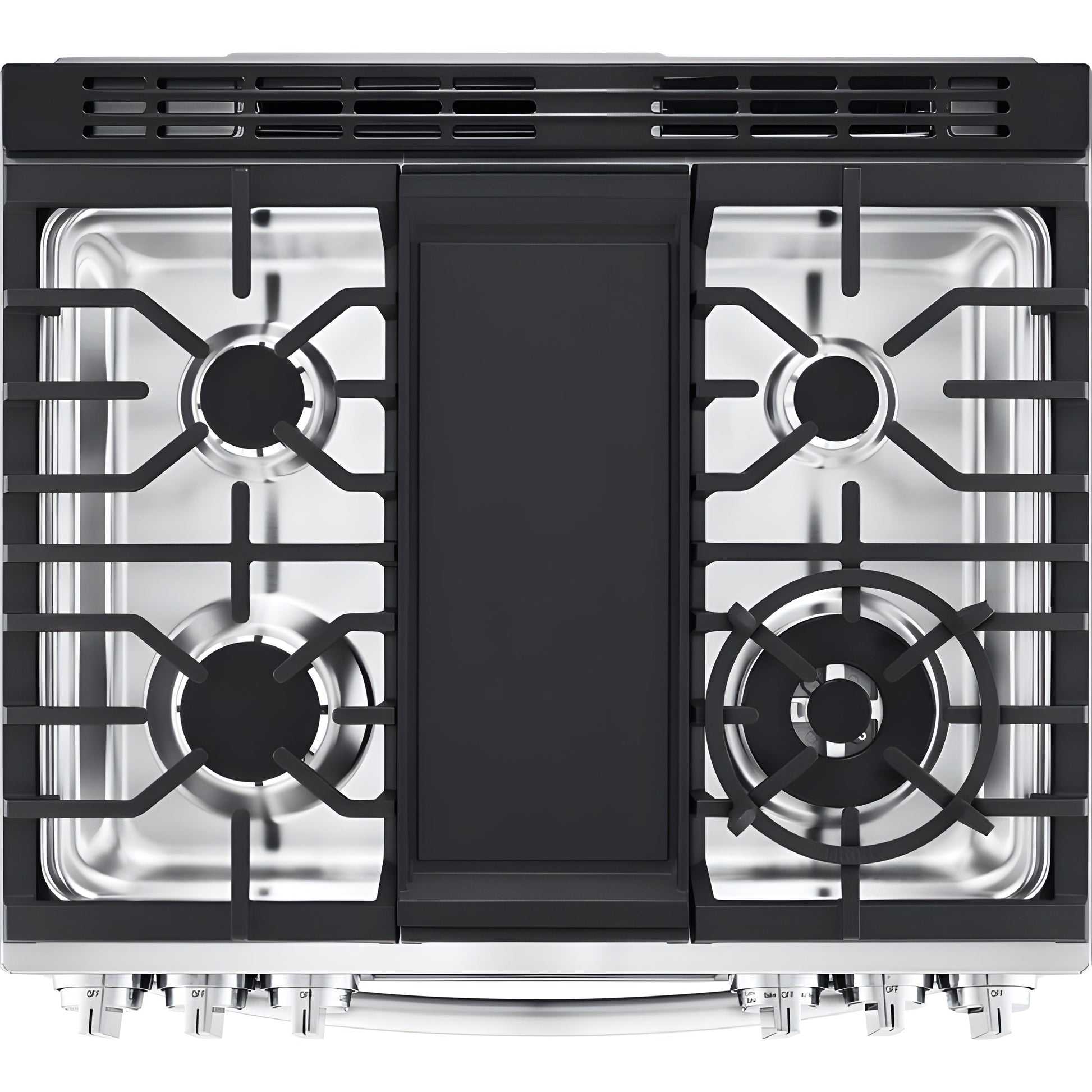 - 5 cooktop burners with removable cast iron griddle