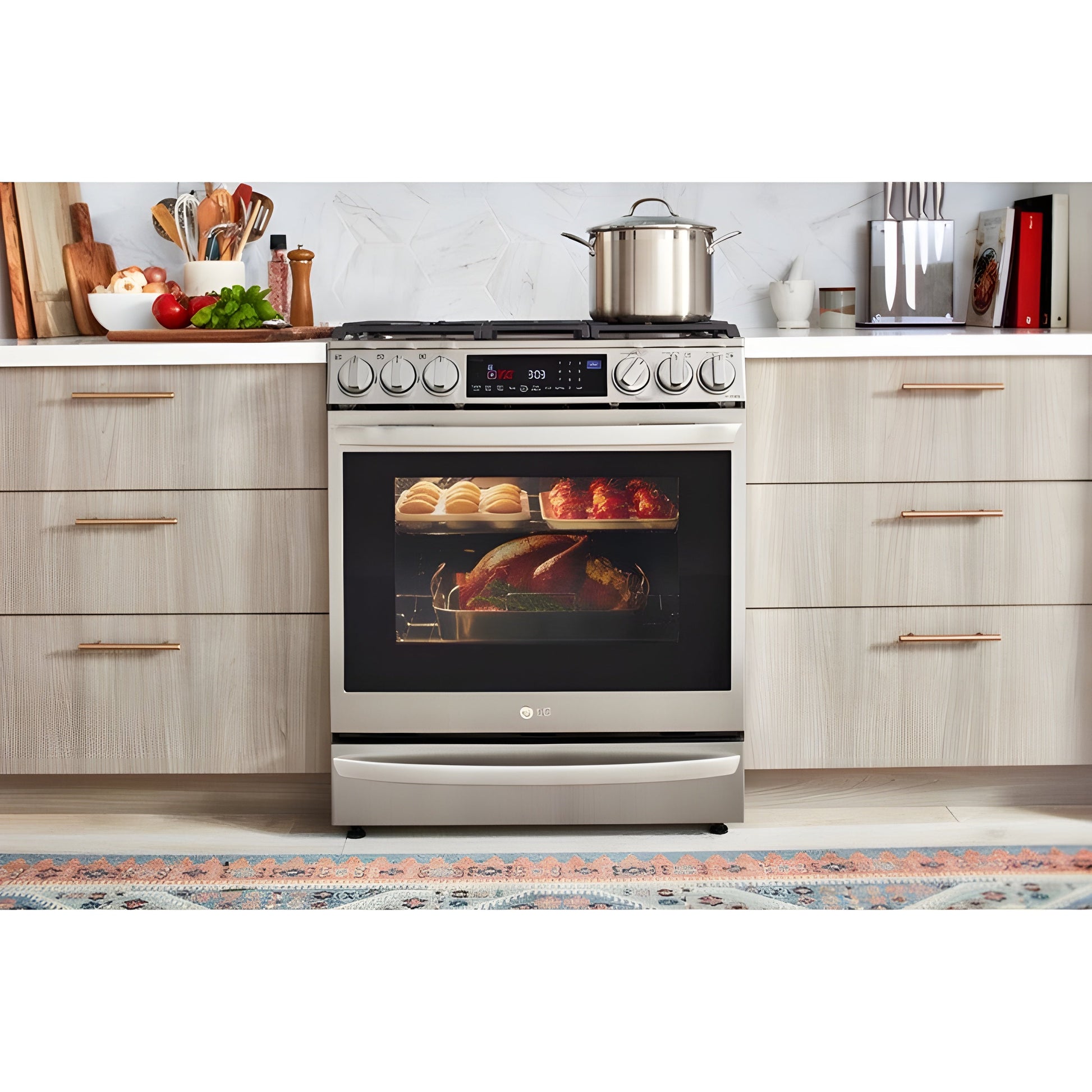 LG 30 in. 6.3-Cu. Ft. Smart Wi-Fi Enabled ProBake Convection InstaView Gas Slide-in Range with Air Fry, Stainless Steel (LSGL6337F)Cooking enthusiasts rejoice—this all-in-one range expands your cooking game in ways you never thought possible. Quickly air fry enough hot wings to feed a crowd. Turn out racks of perfectly baked cookies with ProBake Convection. Even try your hand at something new, like Air Sous Vide for your best cuts of meat. No need to buy extra gadgets that just take up counter space. Everything you need is built into one sleek, slide-in design that’s amazingly simple to clean. And if you want to show off a little with the InstaView window and backlit LED knobs, who can blame you?