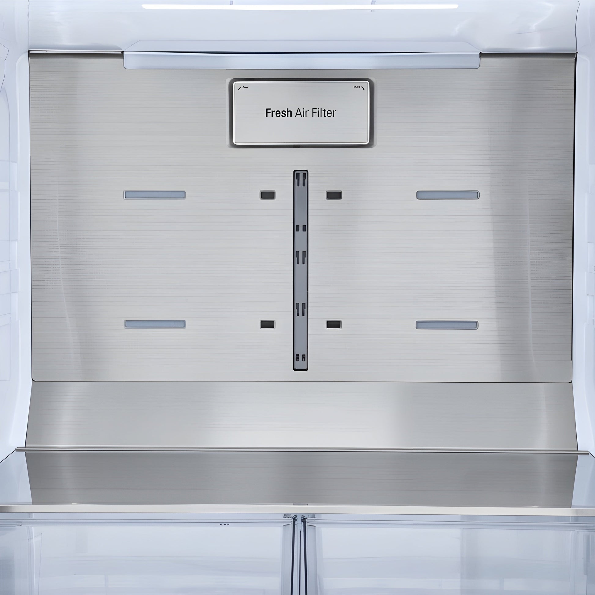 The Measured Fill water dispenser can accommodate everything from small rocks glasses to gallon pitchers. This refrigerator features integrated electronic temperature controls with a smooth white LED display and Micro-Surface LED lighting that beautifully showcases the interior. Door-in-door with adjustable bin allows you to quickly reach what you need without opening the door and releasing cool air.