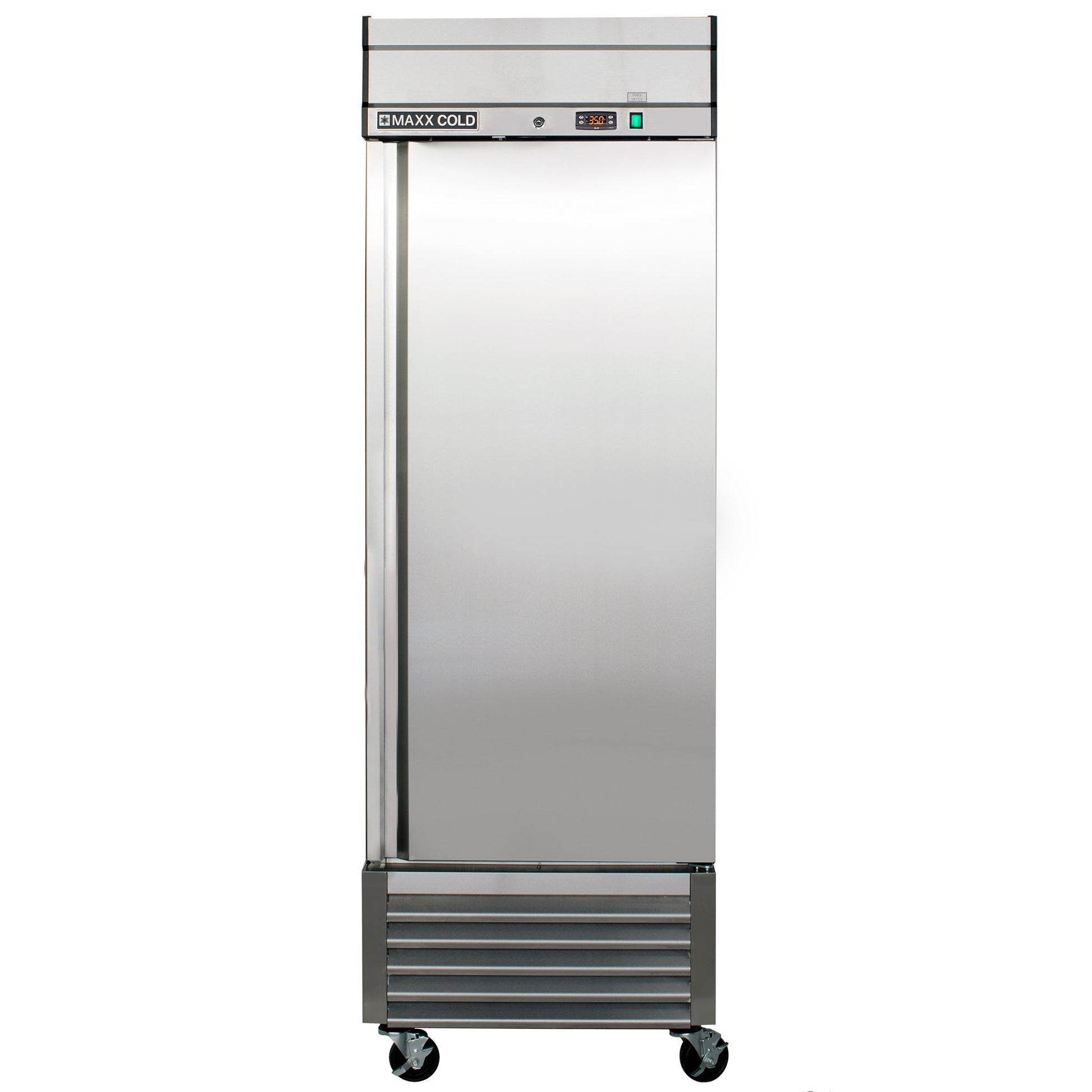 The Maxx Cold Bottom Mount 1 Door Reach-In Refrigerator is the perfect choice for your cold food storage needs in commercial kitchens. This durable reach-in refrigerator is constructed from stainless steel and has a heavy-duty self-closing door with a full-length handle. Optimal temperature control is provided by extra thick environmentally safe, CFC-free polyurethane foam insulation. An automatic on-off door switch controls the interior lighting and cooling air fans. This refrigerator has door locks and password protected solid state digital temperature controls to keep your contents secure. A programmable automatic defrost system prevents the evaporator from icing and keeps the unit at peak operating condition. Keep your food organized with 19.3 cubic feet of storage space plus three heavy-duty corrosion-resistant poly-coated shelves. Four swivel casters ensure easy maneuvering and mobility, while the bottom mount utility compartment delivers easy service access. The stainless steel refrigerator has a large, easy-to-read digital display that shows the internal temperature, which is maintained at 33°F to 41°F (1°C to 5°C), in Fahrenheit or Celsius. You won’t have to worry about losing food because the open door alert beeps when the door has been left open or ajar. Choose the Maxx Cold Bottom Mount 1 Door Reach-In Refrigerator for your foodservice needs.