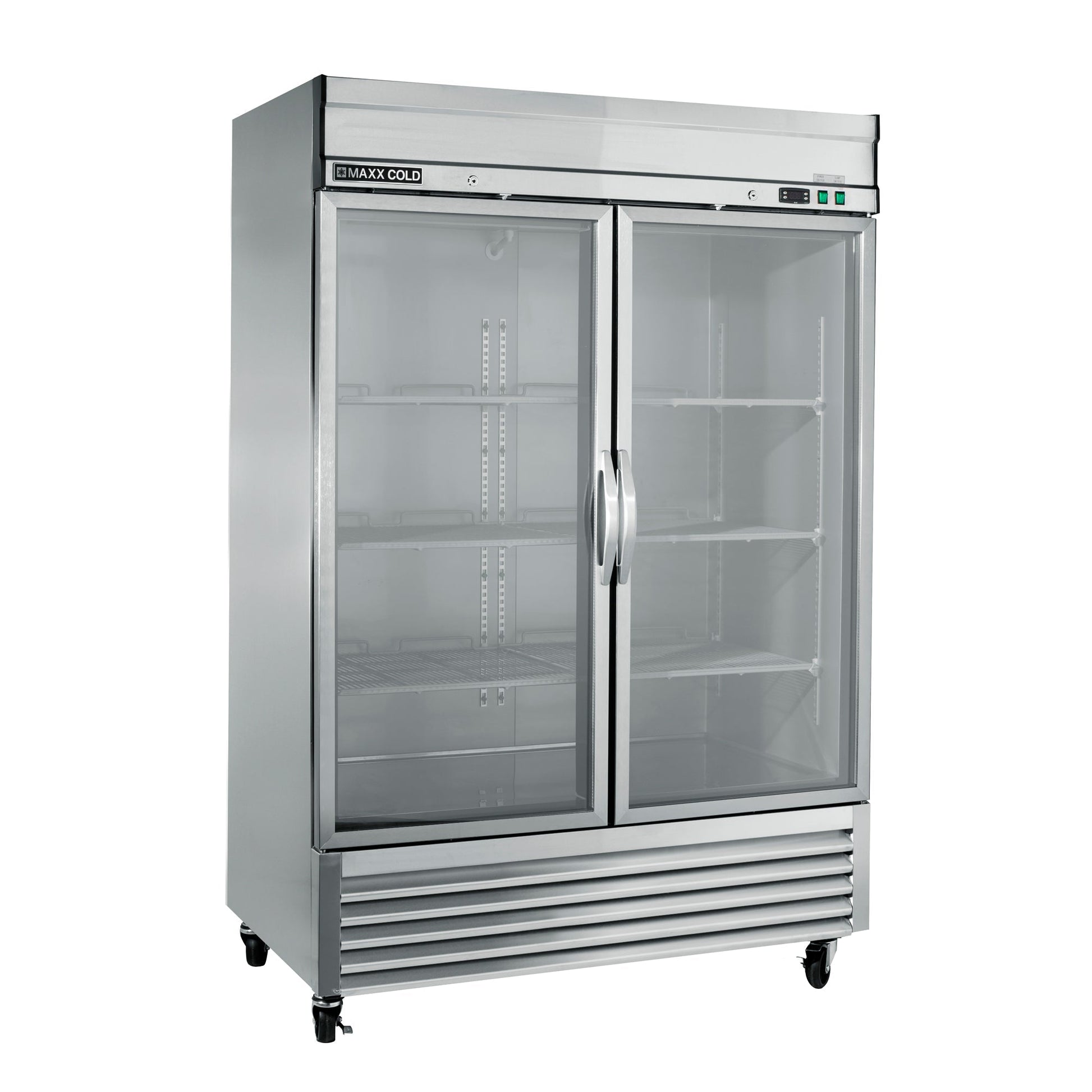 The Maxx Cold Bottom Mount 2 Glass Door Reach-In Refrigerator is the perfect choice for your cold food storage needs in commercial kitchens. This durable reach-in refrigerator is constructed from stainless steel and has two heavy-duty self-closing glass doors with curved handles. Optimal temperature control is provided by extra thick environmentally safe, CFC-free polyurethane foam insulation. Interior lighting lets you easily see what’s inside and is controlled by a manual on-off switch. This refrigerator has door locks and password protected solid state digital temperature controls to keep your contents secure. A programmable automatic defrost system prevents the evaporator from icing and keeps the unit at peak operating condition. Keep your food organized with 42.9 cubic feet of storage space plus six heavy-duty corrosion-resistant poly-coated shelves. Four swivel casters ensure easy maneuvering and mobility, while the bottom mount utility compartment delivers easy service access. The stainless steel refrigerator has a large, easy-to-read digital display that shows the internal temperature, which is maintained at 33°F to 41°F (1°C to 5°C), in Fahrenheit or Celsius. You won’t have to worry about losing food because the open door alert beeps when the door has been left open or ajar. Choose the Maxx Cold Bottom Mount 2 Glass Door Reach-In Refrigerator for your foodservice needs.