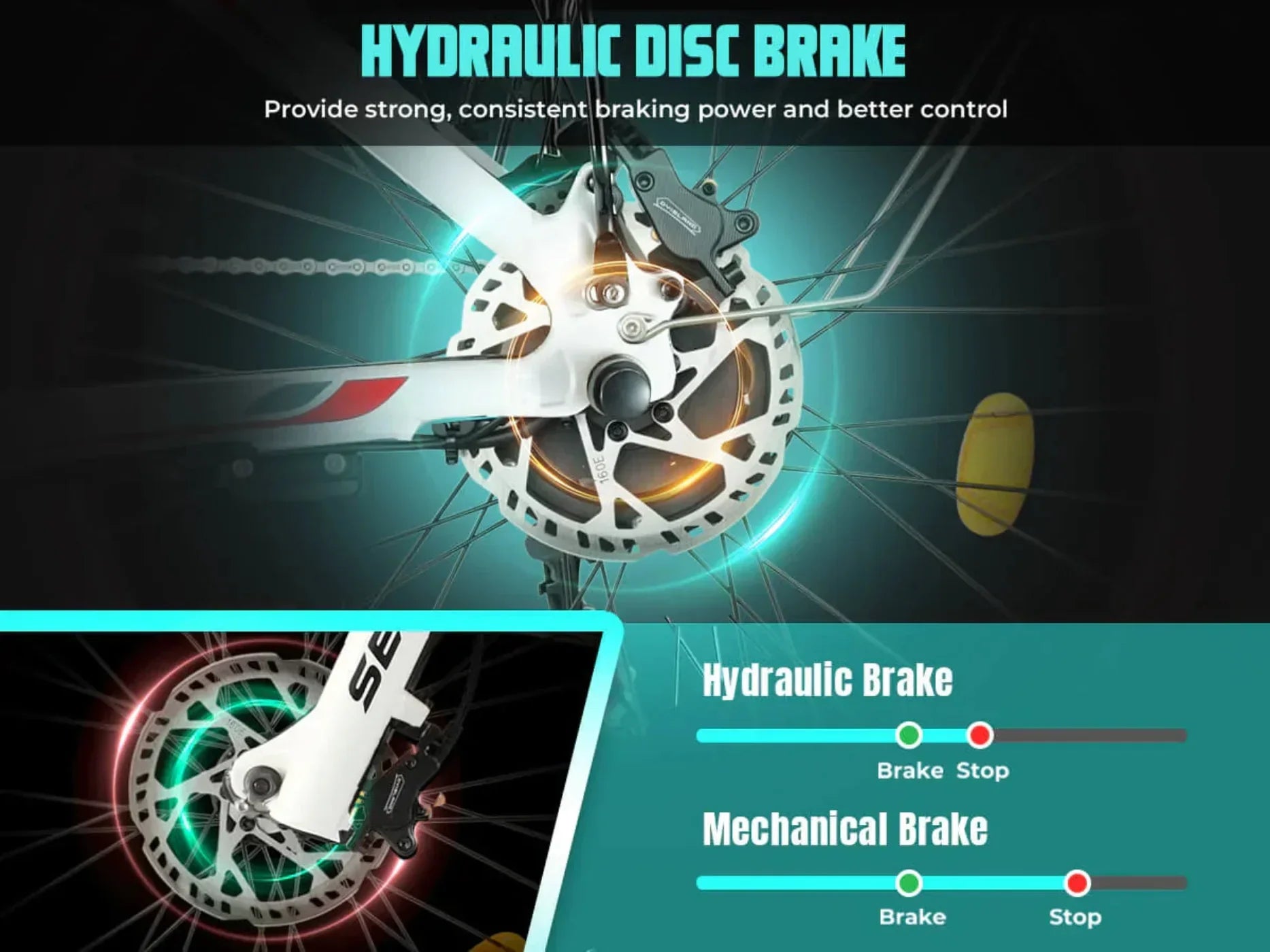 Superior Braking System: High-performance hydraulic disc brakes with mineral oil ensure reliable stopping power and resistance to moisture and corrosion, crucial for all-weather riding.
