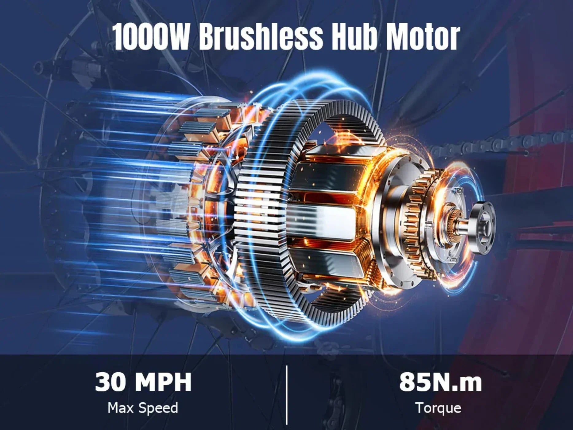 | Motor | 1000W (1200W peak) toothed brushless hub motor, 85 N·m torque |
