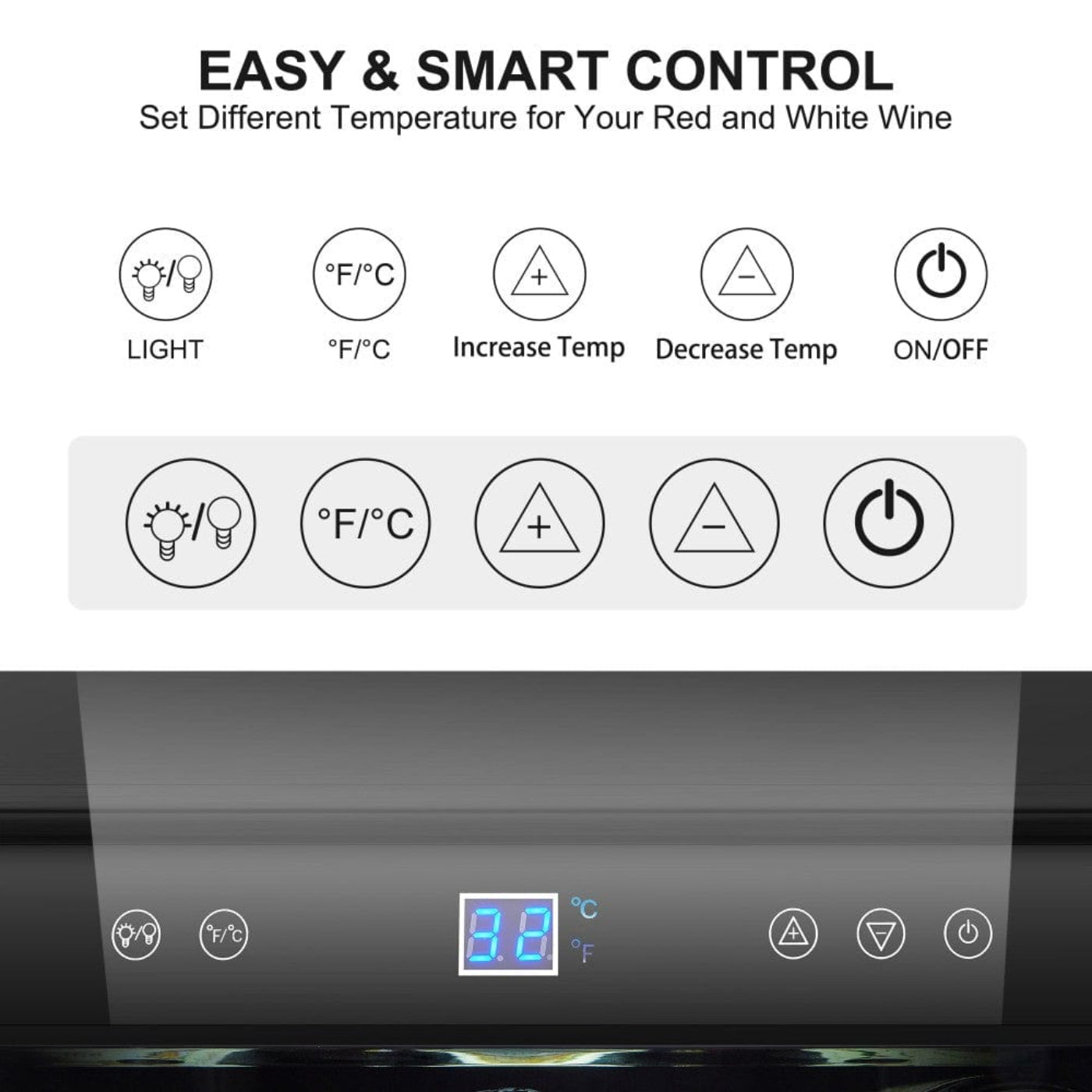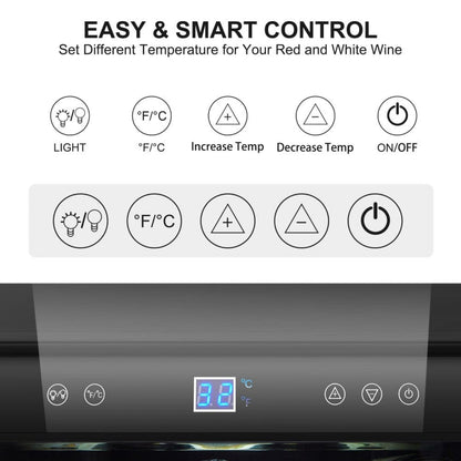 Sinoartizan wine cellar, suitable in your kitchen-preserves the maximum flavor and fragrance of wine. Two separate zones feature independent digital thermostats, letting you chill white and sparkling wine in one section while preserving reds under warmer temperatures in the other. Automatic defrost operation with fan-forced cooling to ensure the temperature stays consistent. Tainless steel door featuring tinted glass with UV protection provides a high-quality look to complement your room and wine collection. It is perfect for those who want to store wine conveniently while freeing up more space in the refrigerator or cabinet.