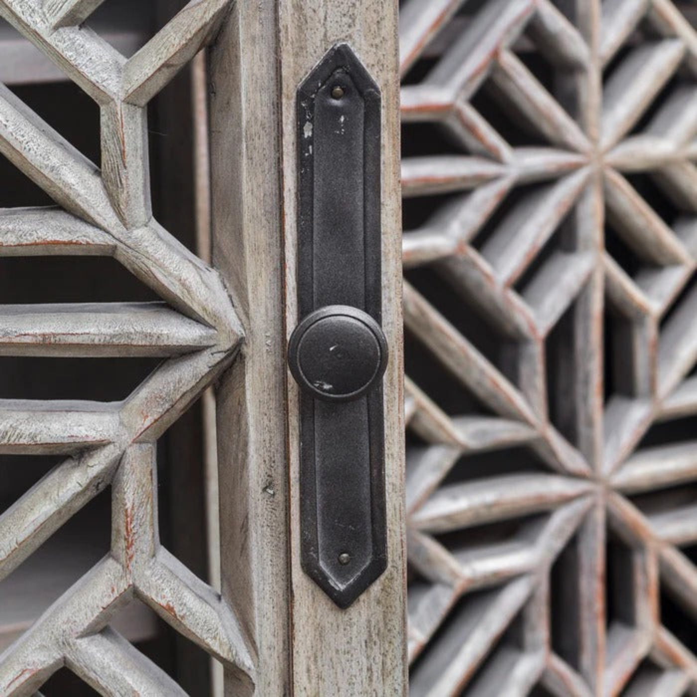 Carved fret-style doors offer a handcrafted, artisanal vibe, adding character to living rooms, entryways, or dining areas.